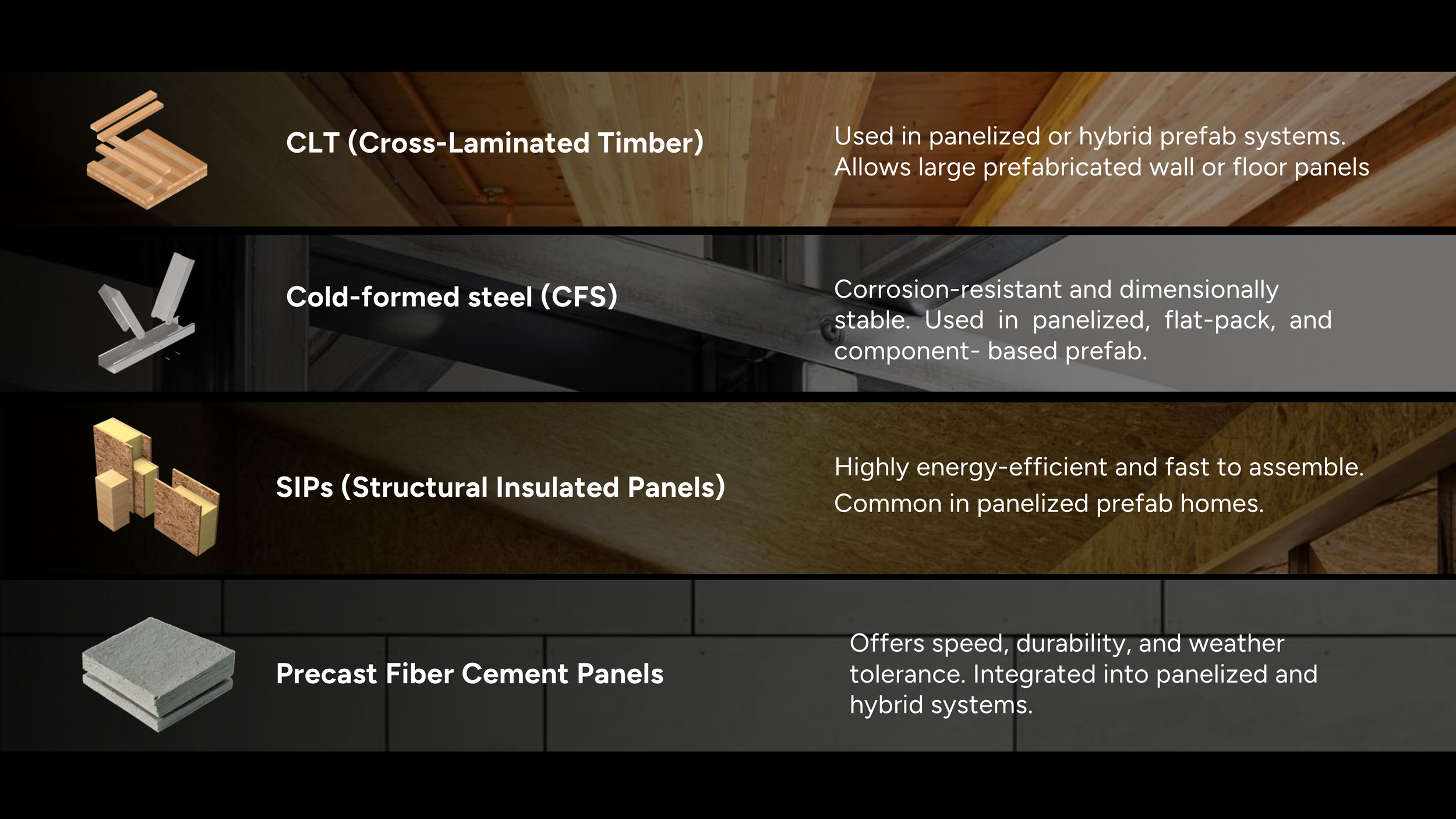 Prefabricated construction systems combine advanced materials and engineered components to deliver faster, more efficient, and higher-quality building solutions. As shown, systems such as CLT (cross-laminated timber) enable large-format structural panels for rapid assembly, while cold-formed steel offers durability, dimensional stability, and resistance to environmental factors. SIPs (structural insulated panels) provide strong thermal performance and energy efficiency, making them ideal for residential applications, and precast fiber cement panels add durability and weather resistance to building envelopes. Together, these systems support panelized and hybrid construction methods, significantly reducing on-site labor, improving quality control, and accelerating project timelines while maintaining long-term performance.